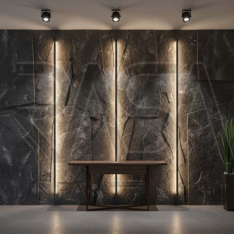 یکی از ترندهای قوی ۲۰۲۵، ترکیب نور خطی با متریال‌های طبیعی است.