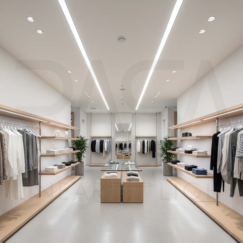 برای مثال، در فروشگاه پوشاک، استفاده از لاین نوری گرمتر در بخش پرو و نور سفید در قسمت نمایش محصولات باعث ایجاد تضاد بصری جذاب میشود. همچنین، استفاده از لاین نوری با قابلیت تنظیم شدت نور (Dimmable) کمک میکند تا در ساعات مختلف روز، نور محیط تنظیم شود.